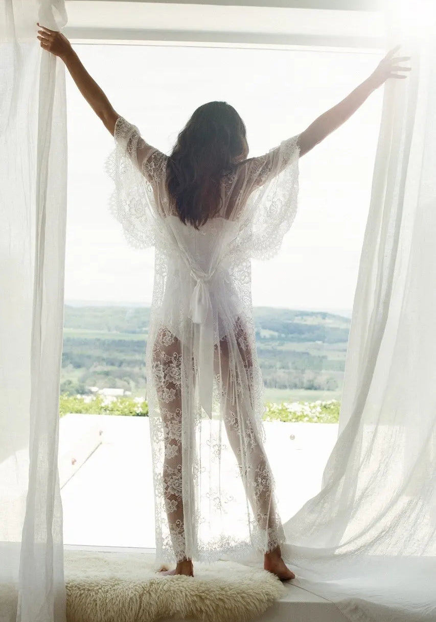 Delicate and bohemian, our Madonna Lace Robe is inspired by the Italian Renaissance. Lovers of lace will adore this beautiful bridal robe.