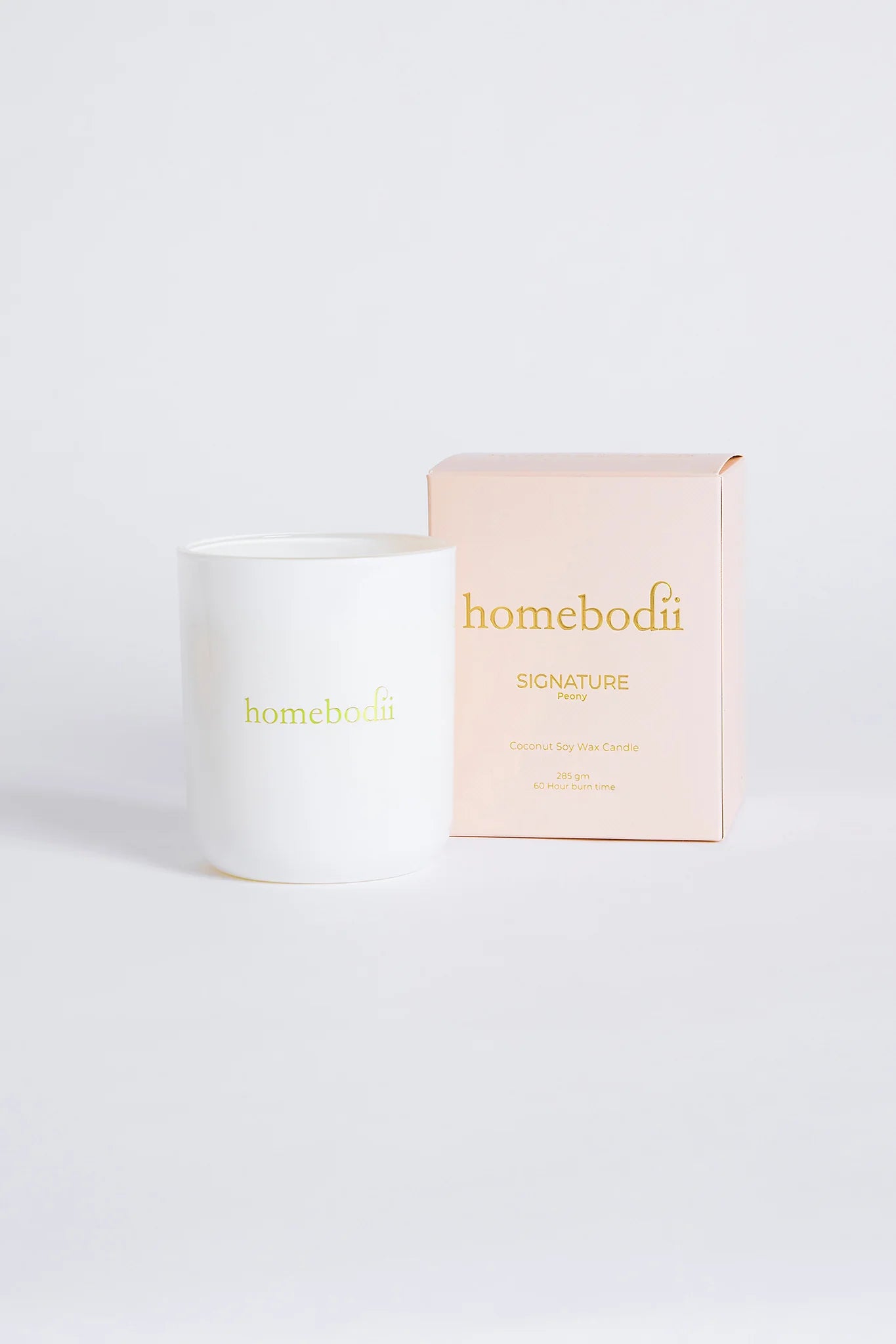 Our Homebodii Signature Candle is made from coconut and soy and oozes our known and loved peony scent. Have this alight while making dinner, watching a movie or in the bedroom to create an alluring ambience.
