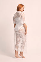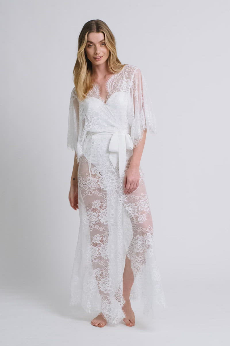 Crafted with the utmost attention to detail, the Kassiah Kimono Lace Robe features intricate lacework that dances gracefully across its fabric. This delicate lace is complemented by an opulent satin belt, adding a touch of luxury and sophistication to the ensemble. As you slip into this ivory lace bridal robe, you'll instantly feel like the embodiment of timeless beauty.
