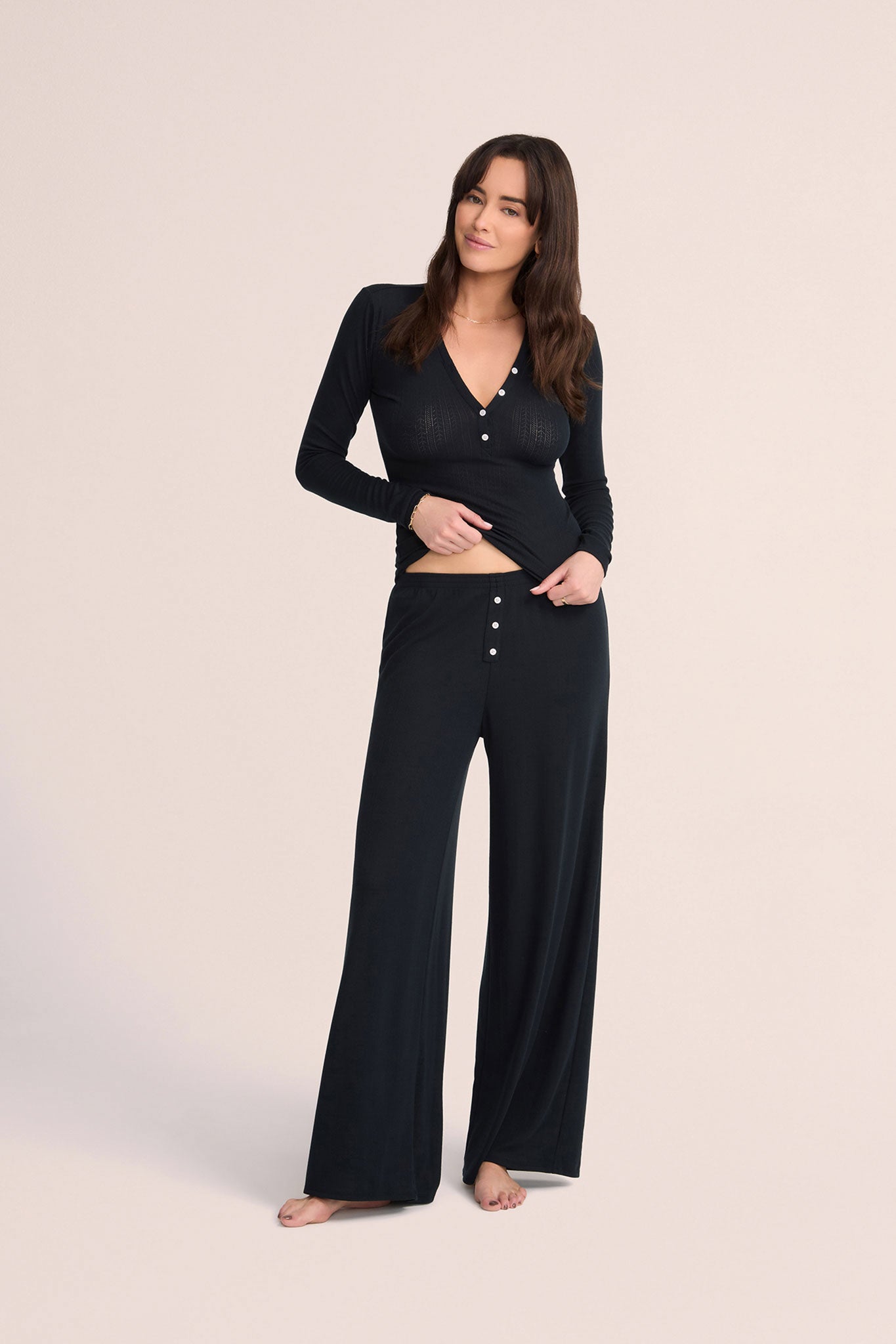 Wrap yourself in the soft elegance of the Pointelle Lounge Set in Black, where comfort meets timeless femininity. Crafted from the softest fabric, this set is lightweight, airy, and beautifully delicate with its signature open-knit design.