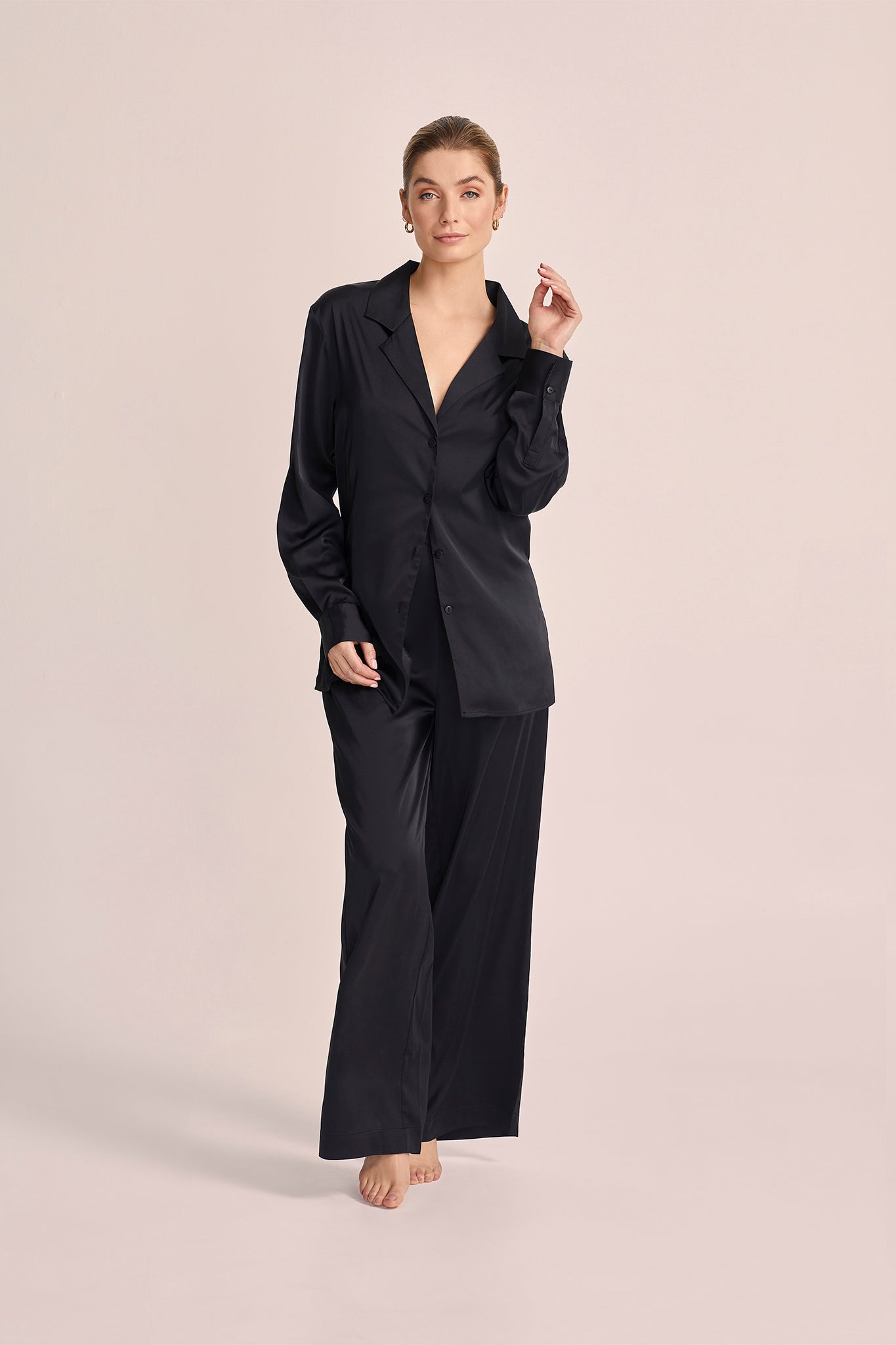 Perfect for cosy nights in, The Tal Set offers a peaceful night's sleep with its plush comfort. However, its chic design and impeccable craftsmanship allow for effortless transitions from loungewear to a night out. Paired with heels, the set exudes sophistication, with the peek of the bra from the collection adding a touch of allure.