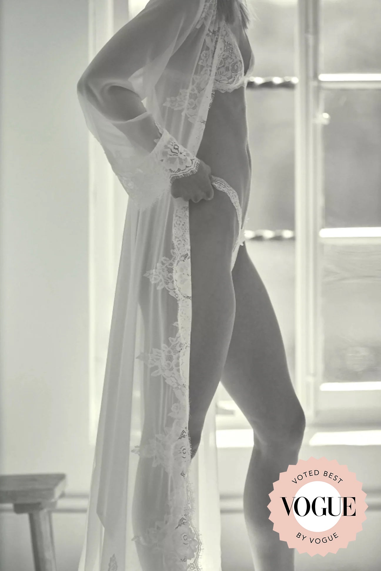 A favourite among brides worldwide, the Helena makes an unforgettable bridal robe — the ideal choice for wedding mornings, pre-ceremony photos, or simply adding a touch of luxury to your getting-ready ritual. The long, flowing silhouette drapes beautifully, while the exclusive lace detailing reflects Homebodii’s dedication to artistry and craftsmanship.