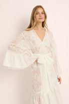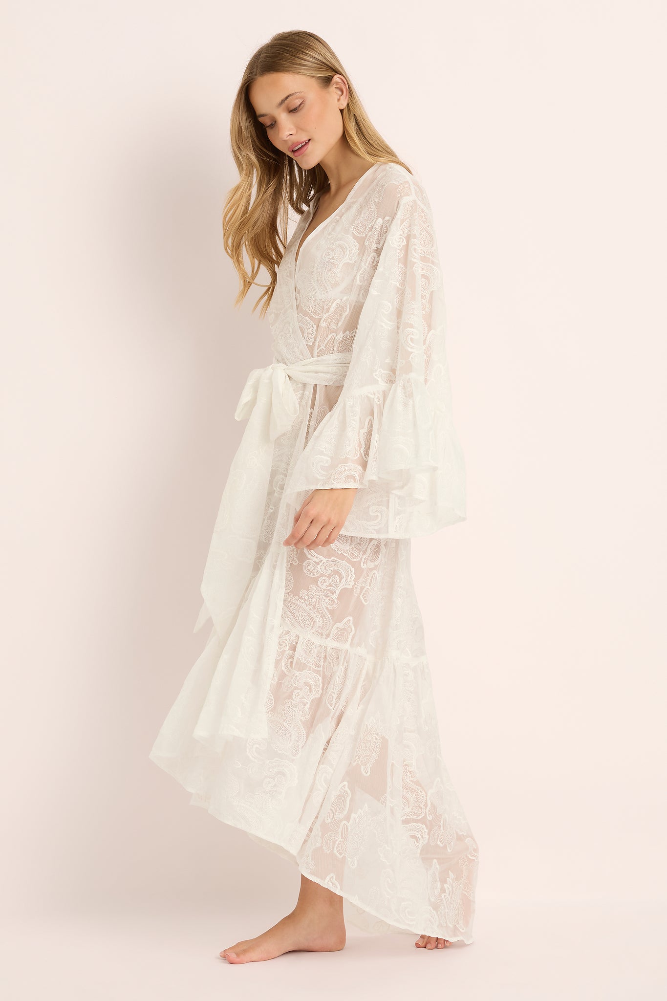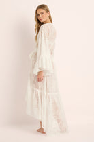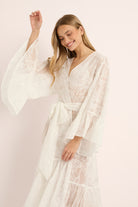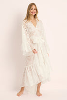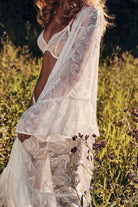 Romantic, floaty, and made to make an entrance the Kalina Paisley Kimono is your ultimate sheer-luxe layer for bridal mornings and beyond. Crafted in delicate paisley lace with a sweeping maxi length, it drapes beautifully over lingerie or swim, with soft fluted sleeves and a waist tie that cinches just right.