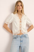 The top is delicately adorned with intricate floral cotton lace tracing the neckline, shoulders, cuffs, placket, and hem. Buttons trail down the center front, adding a nostalgic, heirloom finish. The matching shorts mirror this softness, creating a relaxed yet refined silhouette designed for languid mornings and moonlit evenings.