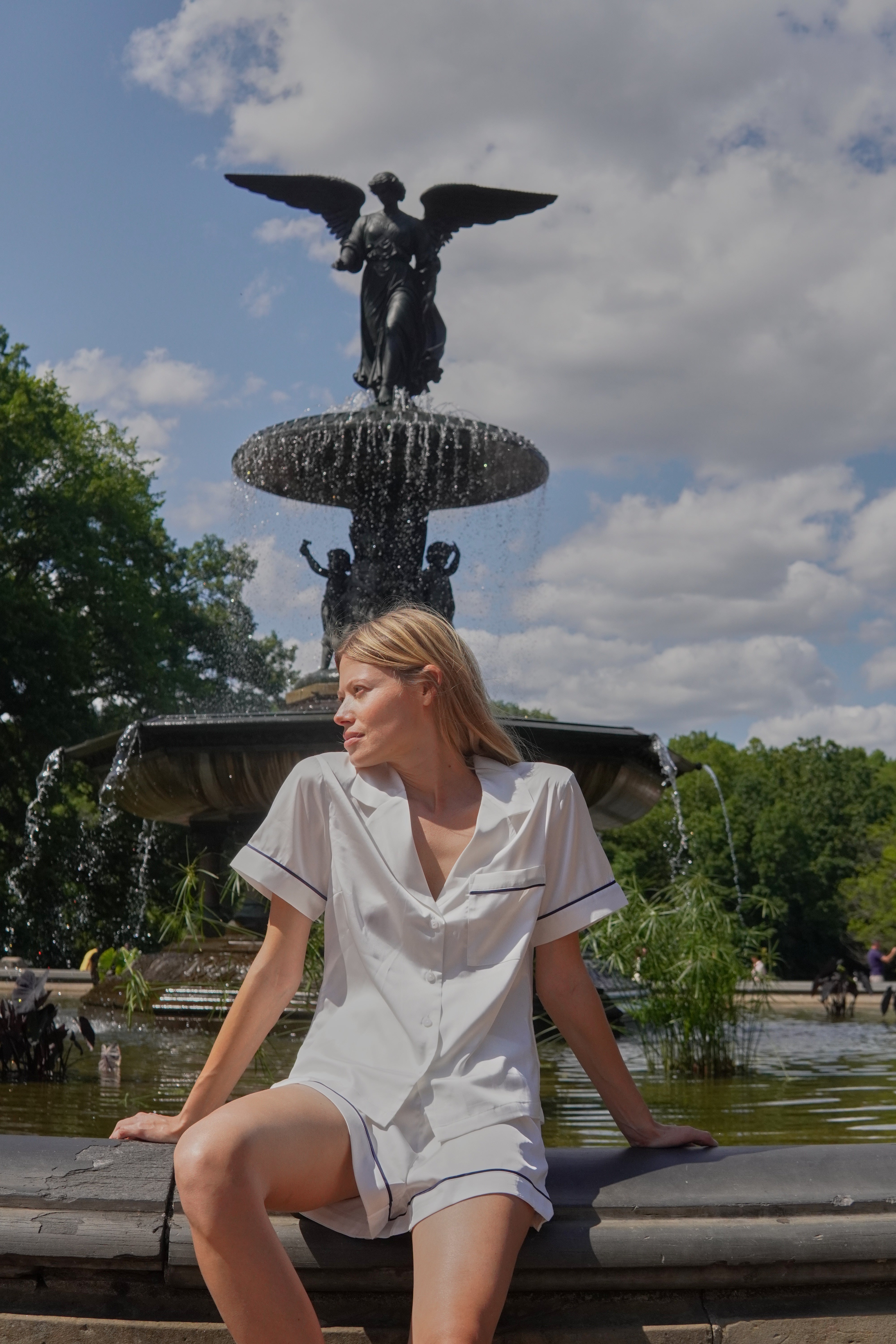 Crafted from premium non-crush satin in pristine white with sophisticated navy piping, this set transforms getting ready for bed into something you look forward to. The fabric glides against your skin with a subtle sheen, cool and smooth like silk sheets on a summer night. As you feel the relaxed fit settle perfectly, the day's tension melts away. Whether curling up with a book before sleep finds you, enjoying breakfast in bed on a lazy Sunday, or padding around your home in the quiet morning hours, you'll feel effortlessly elegant. The OEKO-TEX certified satin is gentle enough for the most sensitive skin.