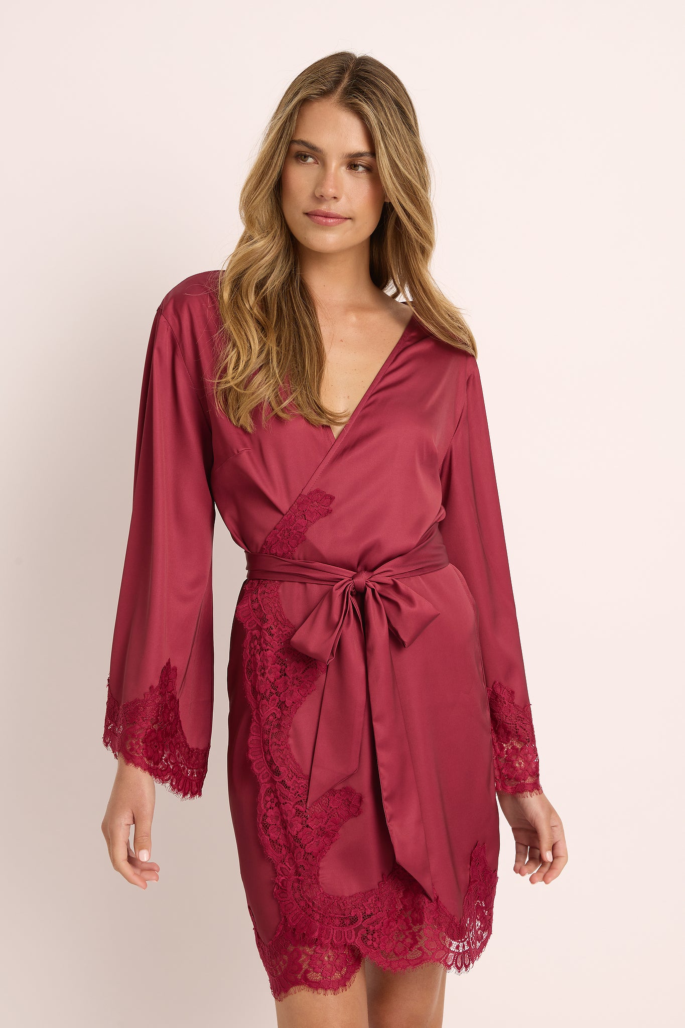 Introducing the Sian Lace Robe, an opulent and enchanting robe that promises to leave a lasting impression. Meticulously fashioned from sumptuously soft satin and delicate lace, this robe is expertly designed to enhance your natural curves, thanks to its cinching waist tie and form-flattering silhouette.