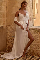Elevate your loungewear with the Homebodii Valentina Robe, a perfect blend of timeless elegance and modern sophistication. Crafted from luxurious chiffon, this robe drapes effortlessly over the body, creating a flowy and graceful silhouette. The intricate lace detailing along the neckline and sleeves adds a delicate, feminine touch, while the robe’s high-low hemline brings a contemporary twist to its classic design.
