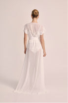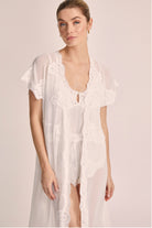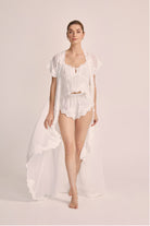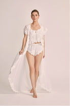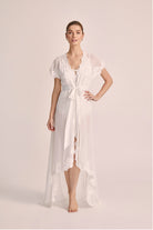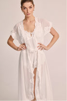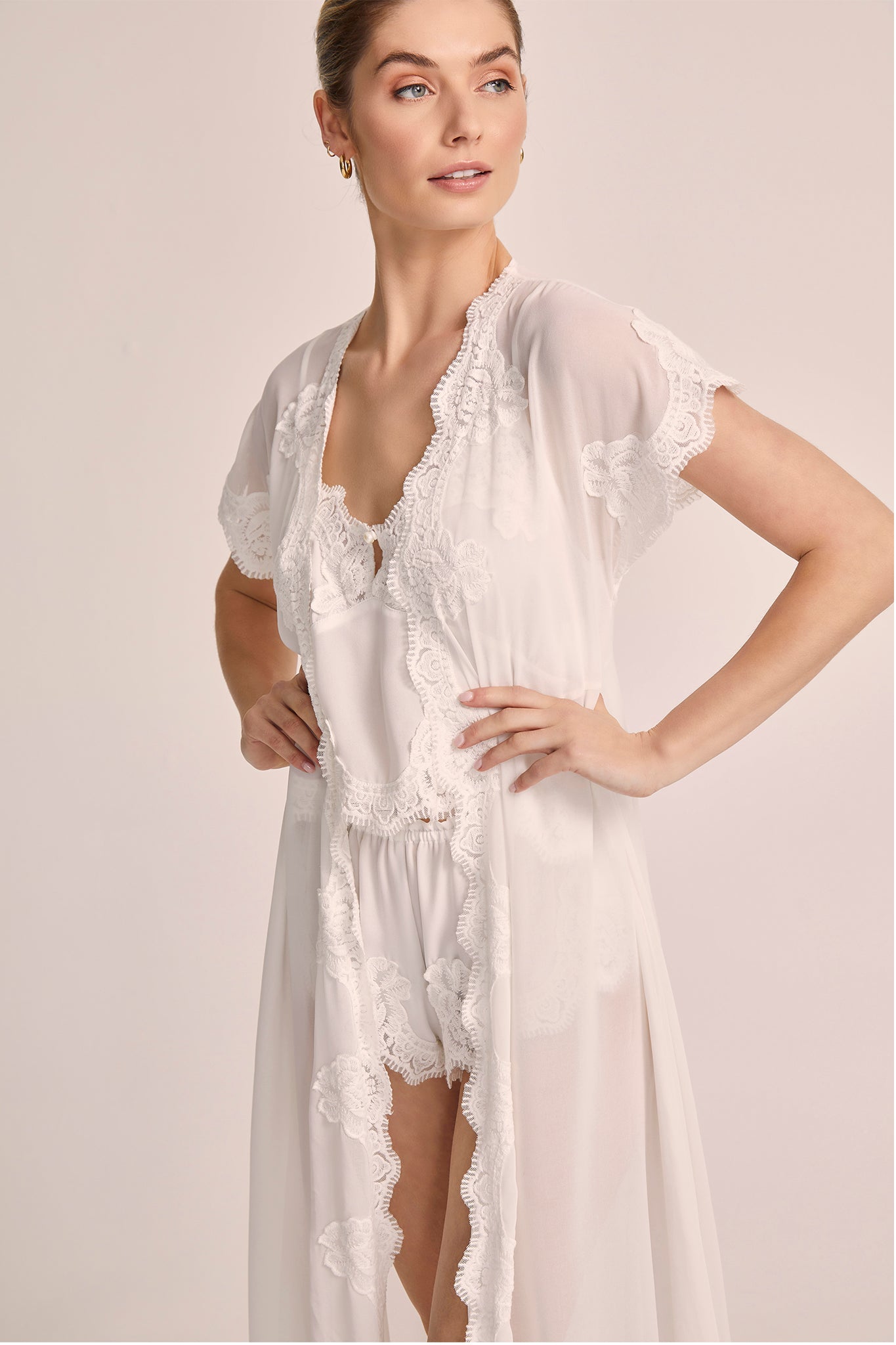 The short sleeves offer a light and breezy feel, making it ideal for warmer days or layering over your favourite sleepwear. Whether you're getting ready for a special occasion, enjoying a relaxing morning, or embracing a quiet evening, the **Valentina Robe** envelops you in luxury and style.