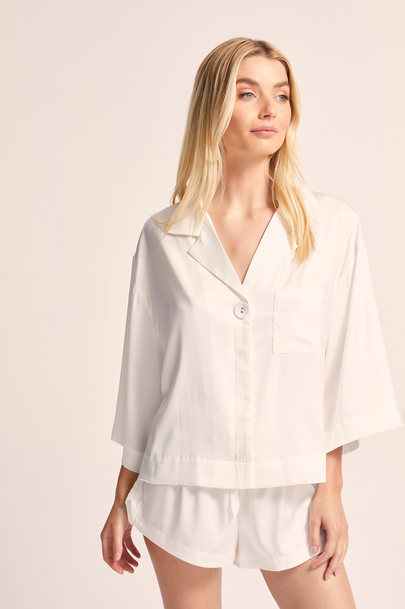 The Rylee shirt features an oversized silhouette, exuding a sense of modernity and contemporary flair. With its button-down front, it adds a touch of elegance and versatility to the overall design. The removable waist tie enhances the set's adaptability, allowing you to customize the fit and achieve the perfect amount of definition to suit your preference.