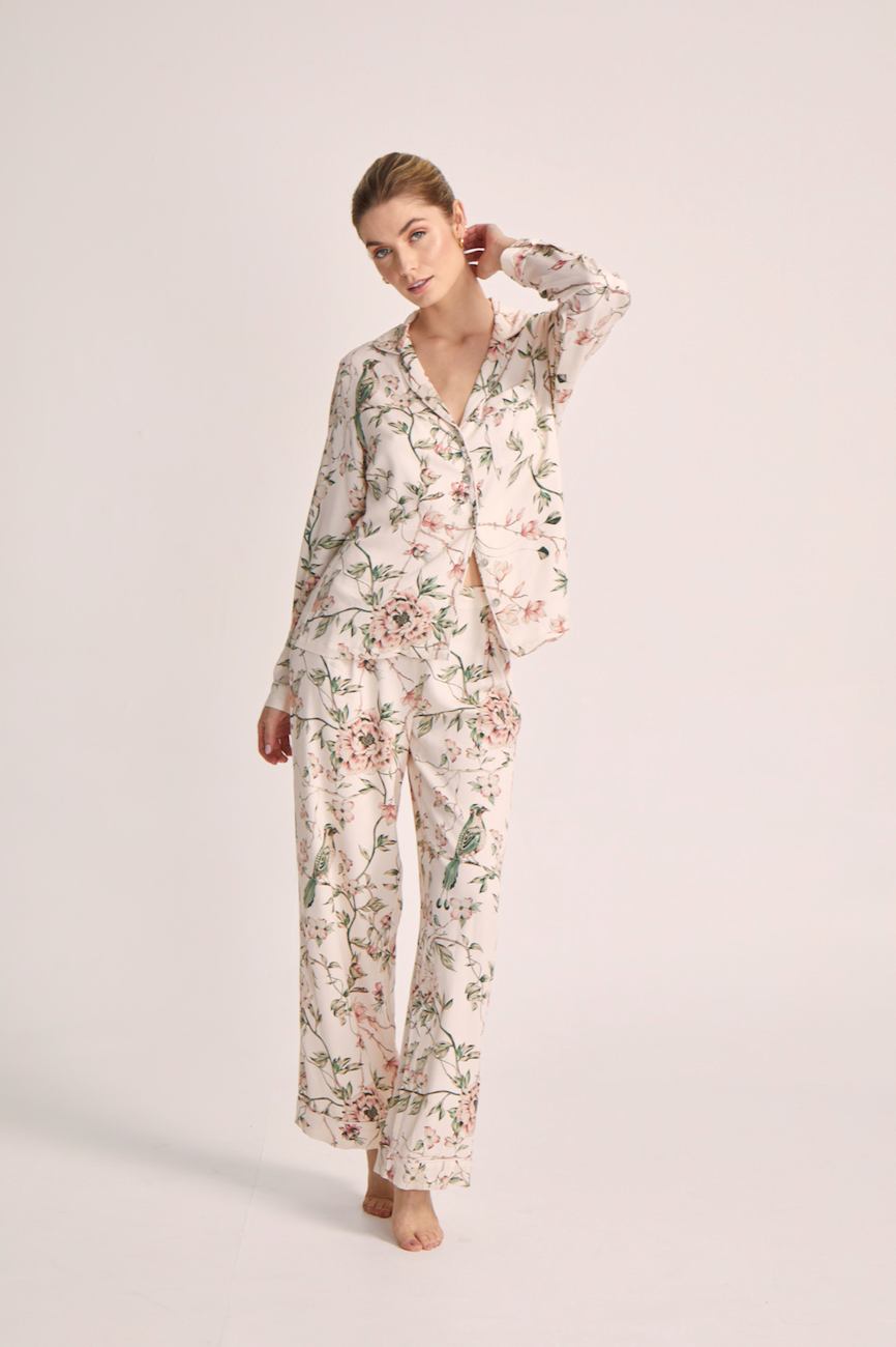 Our exclusively designed Botanica print in our pyjama lounge set is a beautiful balance between comfort and style. A luxuriously soft blush colour featuring a floral & bird print.