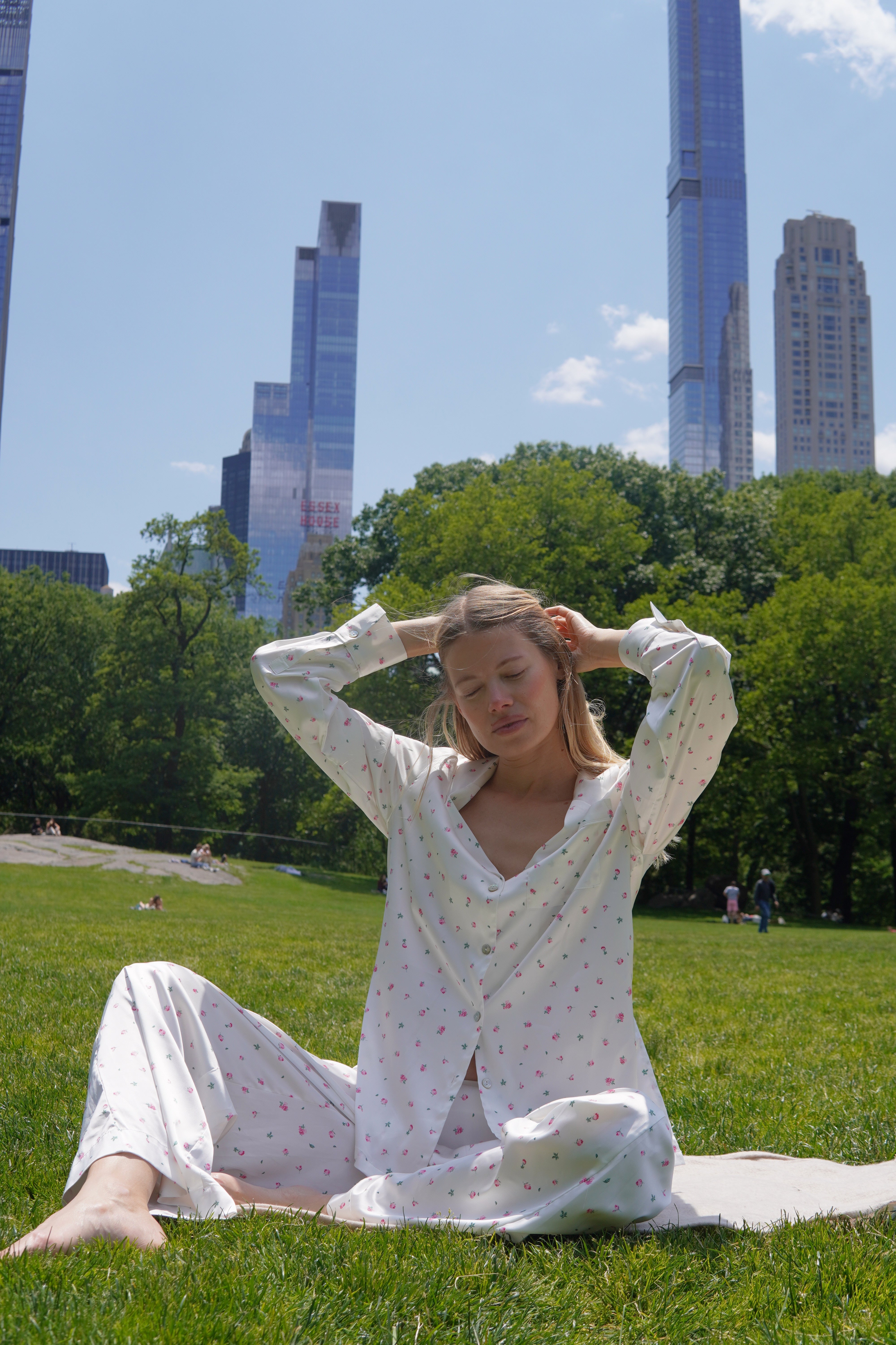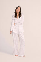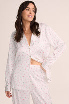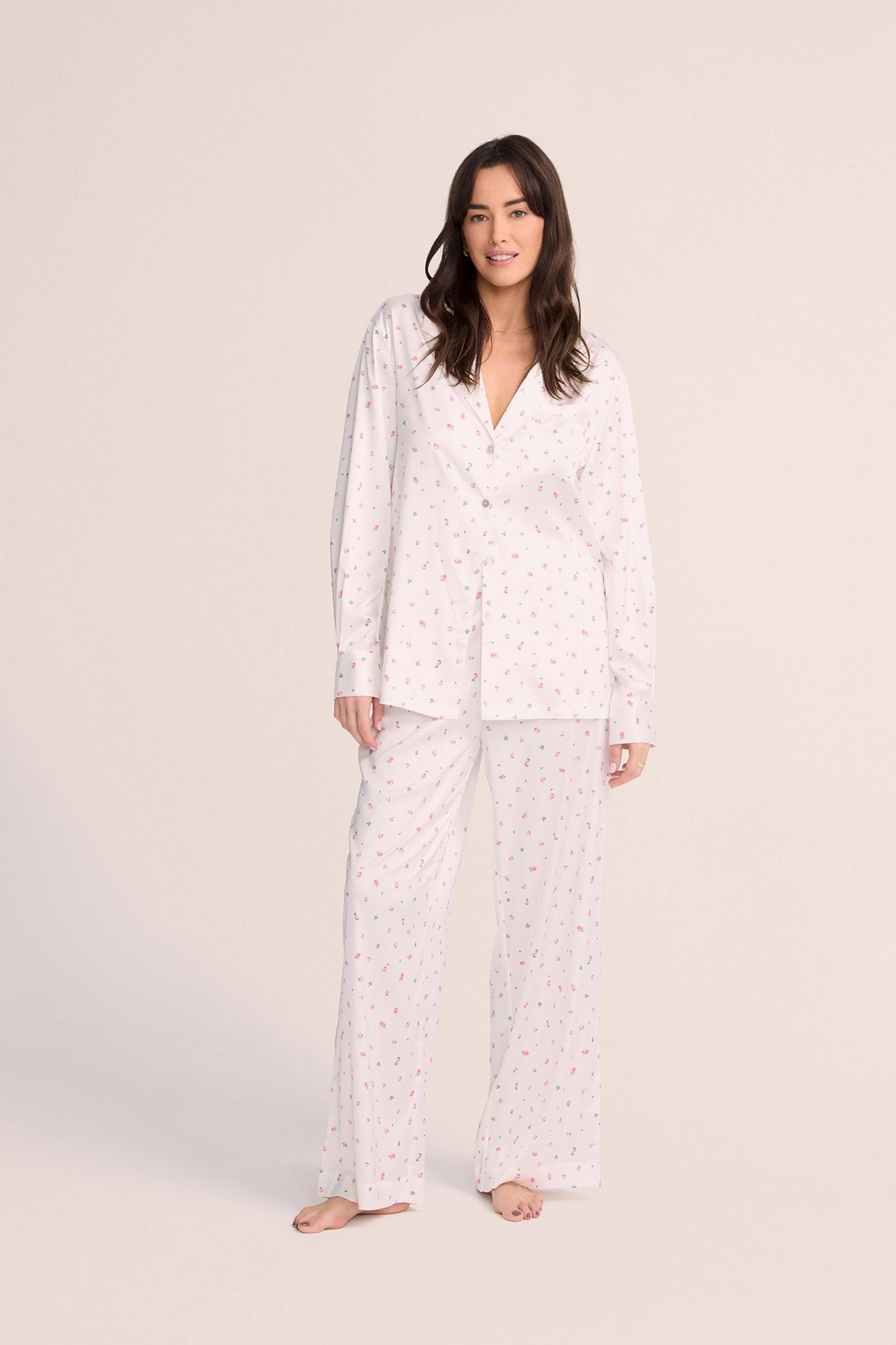 The Rosie Lounge Pyjama Set features a delicate rose print on a pristine white base, offering a feminine and elegant aesthetic. The long-sleeve button-up top includes a notched collar and chic piping detail, while the matching full-length pants are designed with an elasticated waistband for a perfect balance of comfort and style.