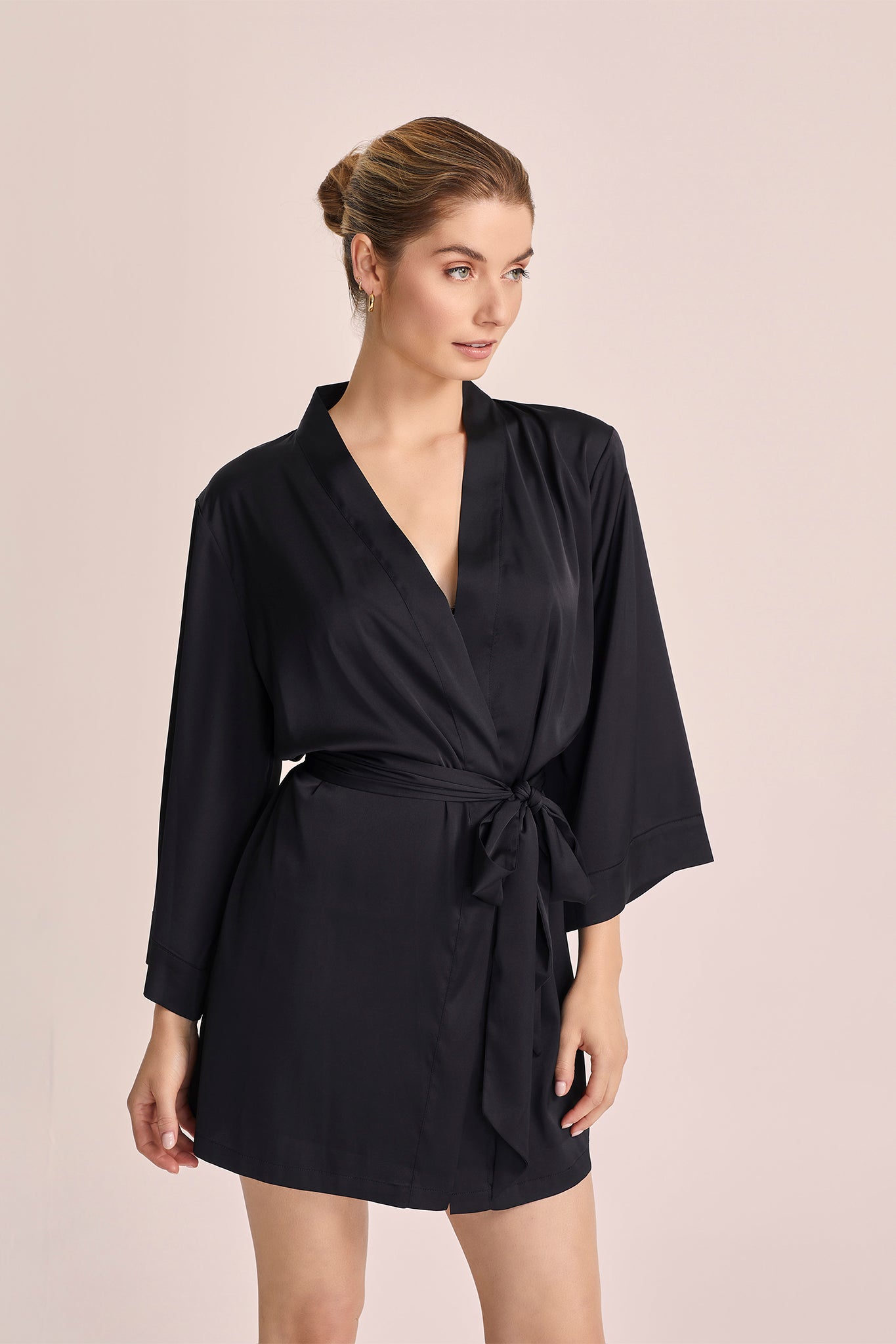 Boasting a sleek silhouette and timeless allure, The Evie Robe exudes sophistication with every wear. Wear it as a robe for cozy evenings at home, or layer it over the Minka Short Slip as a chic jacket for an effortlessly stylish look. For a coordinated ensemble, pair it with the Tahlia Lounge Pants and Leda Cami Set for the ultimate in elevated loungewear.
