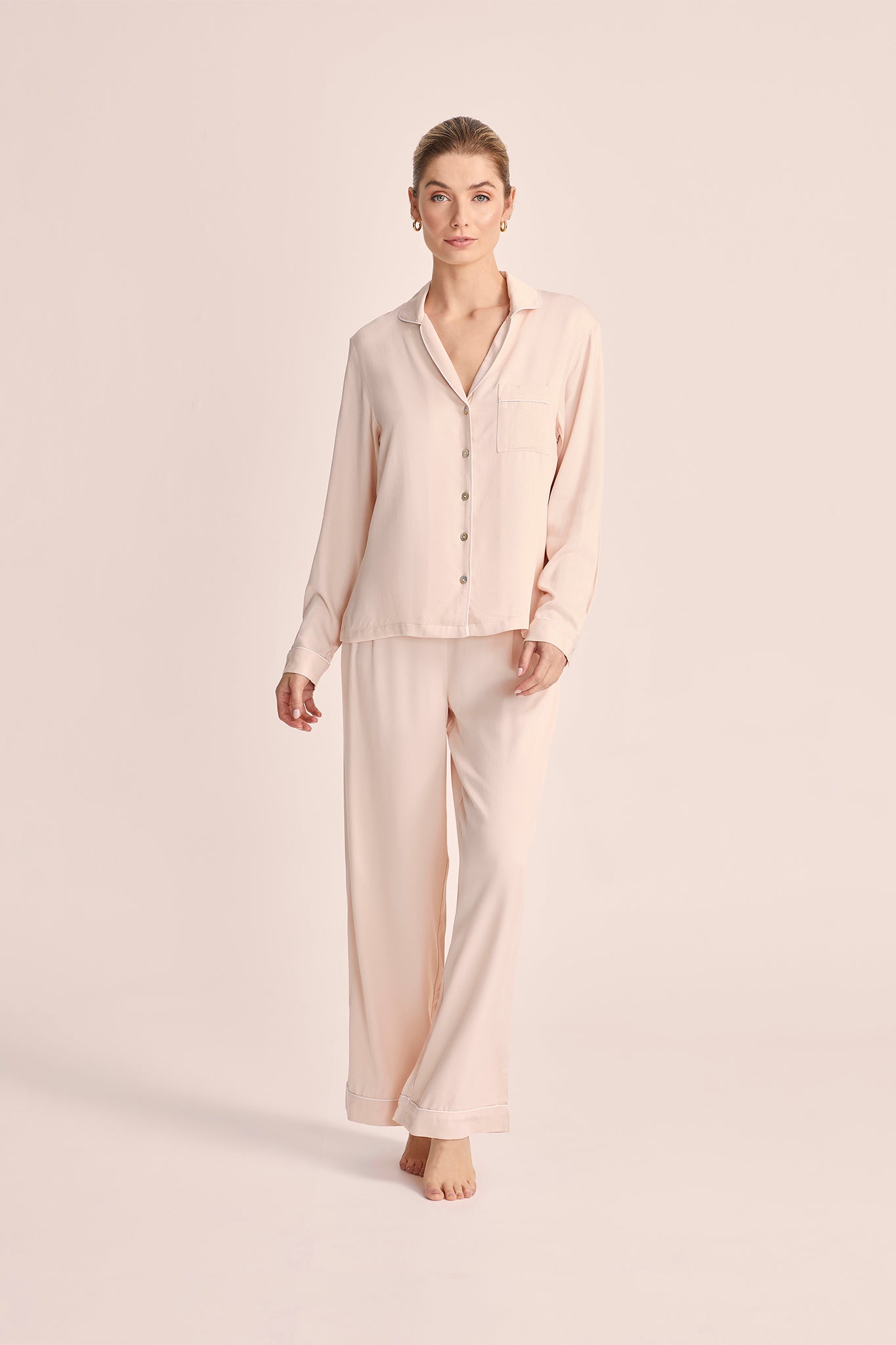 Meet Eva. Eva is a 100% sustainable, breathable, buttery soft set of matching short pjs with timeless piping trim. Not only is Eva beautiful to wear, she’s also kind to the Earth. Made from certified TENCEL™ material derived from sustainably harvested wood pulp and created using environmentally considerate processes, you and the planet will love our Eva pyjamas.