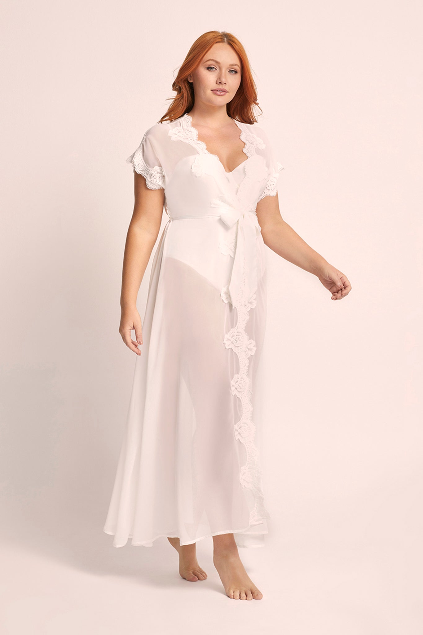 Crafted from semi-sheer white chiffon, the Farrah robe is adorned with a lavish display of elegant lace rosettes that cascade gracefully along its surface. The lace-cuffed sleeves add a touch of vintage charm, creating a harmonious blend of playfulness and sophistication that is simply irresistible.