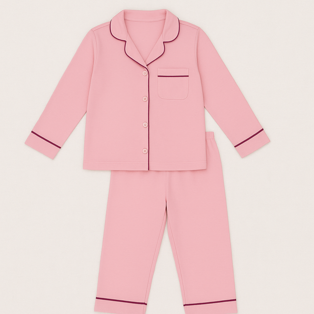 Crafted from 95% bamboo and 5% spandex in soft blush pink trimmed with deep berry piping, this set blends timeless charm with playful elegance. The super soft bamboo fabric is naturally breathable, hypoallergenic, and gentle on sensitive children's skin. The long-sleeve button-up top and relaxed cropped pants offer freedom of movement while keeping your child snug all night long. OEKO-TEX® certified for safety and FSC® certified for sustainability, ensuring it's as kind to the planet as it is to your little one. Perfect for matching family moments, holiday mornings, or cosy weekends at home.