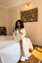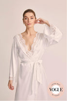 Introducing the Sian Lace Robe, an opulent and enchanting robe that promises to leave a lasting impression. Meticulously fashioned from sumptuously soft satin and delicate cotton lace, this robe is expertly designed to enhance your natural curves, thanks to its cinching waist tie and form-flattering silhouette.