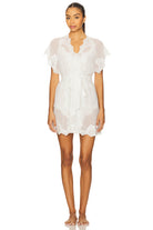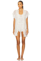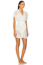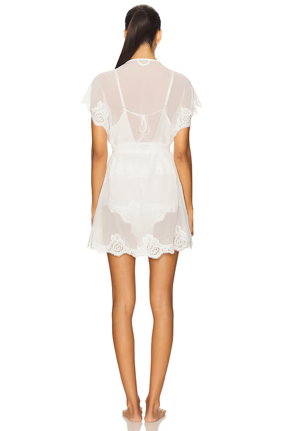 Crafted from luxurious chiffon with intricate lace detailing along the neckline and sleeves, this mini robe drapes effortlessly with a flowy, graceful silhouette. The contemporary high-low hemline adds a modern twist to its classic design, while short sleeves offer a light, breezy feel. Whether you're getting ready for your wedding morning, enjoying a relaxing day at home, or embracing a quiet evening, this robe envelops you in luxury and style. Pairs beautifully with the Valentina cami set or bodysuit for a complete elegant look.