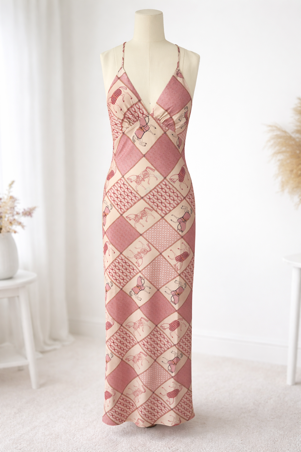 Flowing effortlessly over the body, the long slip features delicately illustrated bridled horses in soft blush and rose tones. Each panel is framed with bridle-inspired borders and vintage motifs, creating a collectible piece that feels both modern and nostalgically refined. The elongated silhouette enhances the artwork, allowing the print to truly shine as it moves with you.
